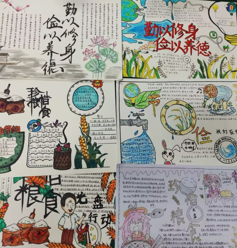 一张张薄薄的纸片承载着中华民族传统美德,一行行文字穿插于富有新意的图画之间,五彩斑斓的笔描绘着同一个主题——勤俭节约,一份份手抄报寄托着参赛同学对改善铺张浪费现象的美好期待,呼吁同学们从身边做起,从小事做起,养成勤俭节约的好习惯。
