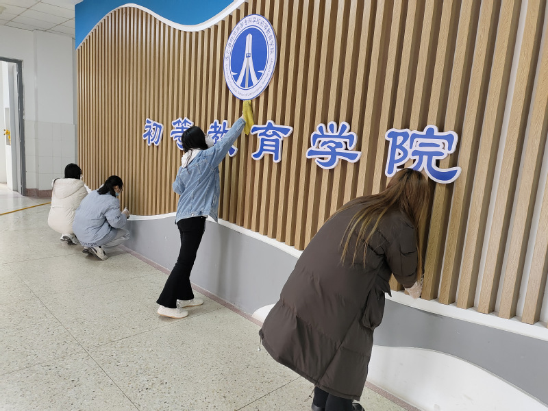 坚持以党建为引领,号召支部党员、员工干部、入党积极分子和员工志愿者们踊跃参加,充分发挥党支部战斗堡垒作用和党员同志的先锋模范作用。活动伊始,党总支书记张志连强调了活动的意义和劳动育人的重要性,指出智贤楼卫生清扫的注意事项及重点。活动现场,同学们迅速投入到劳动中,撸起袖子,拿起铲子,端起盆子,各司其职,通力合作,热火朝天,不怕脏,不怕累,充分发挥党员带头作用,发扬党员干部踏实肯干的作风。通过师生们的共同努力,智贤楼灰尘没了、垃圾不见了,窗明几净,焕然一新,同学们倍感劳动充实,劳动光荣,劳动快乐。