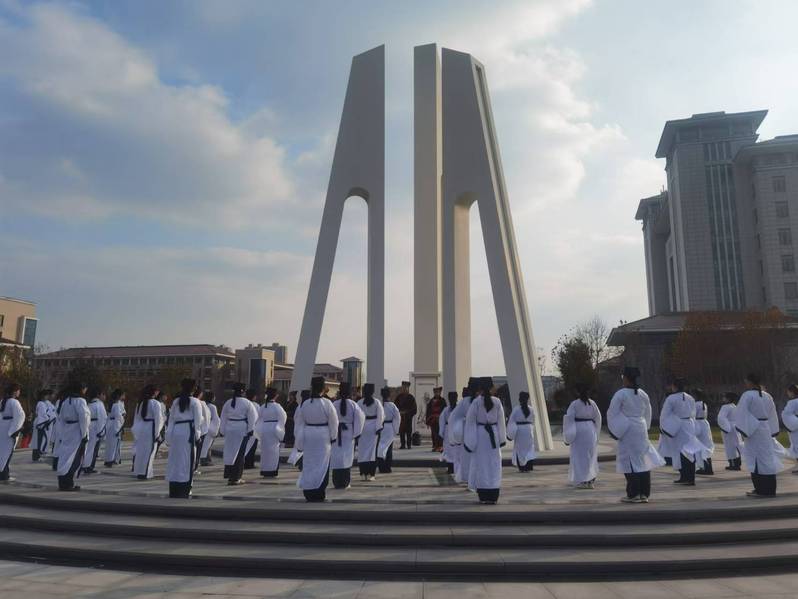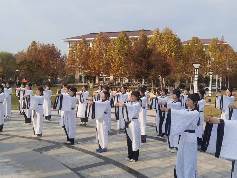 启动仪式后,隆重举办了古人入学时的“拜师礼”。全体师生向先师孔子像行揖礼,员工向教师代表行揖礼;随后,员工献上束脩六礼,教师代表回礼,教师训诫勉励员工,员工明志回应;最后,齐诵经典,朗朗诵读声响彻校园。拜师礼作为本次文化节的首场活动,复原了古代传统的仪式程序,使师生们亲身感受教师职业的崇高,感悟师道传承的意义。