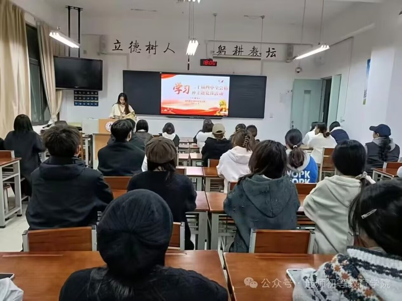 活动以“原文研读+交流研讨+知识问答”的形式展开。与会人员首先集体学习了《中国共产党第二十届中央委员会第四次全体会议公报》,随后观看了专题解读视频,并围绕党的二十届四中全会的重大历史意义、制定“十五五”规划建议的核心要义及中国式现代化建设的实践要求等内容开展交流研讨。入党积极分子汤怡表示:全会提出要办好人民满意的教育,作为未来的小学教师,我将以全会精神为指引,扎实学好专业知识,锤炼教学技能,努力成为让孩子们喜爱、让家长放心的教育工作者。预备党员黄锦表示:党的二十届四中全会审议通过的“十五五”规划建议,为我国未来的发展擘画了宏伟蓝图,我将以全会精神为指引,把人民至上的价值立场转化为踏实学习和志愿服务的实际行动,为实现中华民族伟大复兴的中国梦贡献自己的智慧和力量。最后的知识问答环节气氛热烈。主要聚焦党的二十届四中全会的指导思想、战略布局、主要目标和“六个坚持”重要原则等关键知识点进行提问,与会人员踊跃举手、回答准确,现场掌声不断。通过“以赛促学、以答提效”的方式,不仅帮助大家巩固了学习要点,更营造了“比学赶超、互帮互学”的良好氛围。